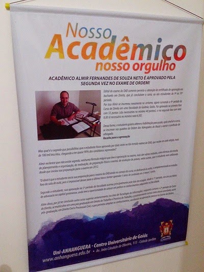 – 11/04/2015 – “Como se preparar de forma correta e ser aprovado na OAB” – Palestra proferida para 250 alunos do Curso de Direito do Centro Universitário de Goiás – Uni-Anhanguera em Goiânia;